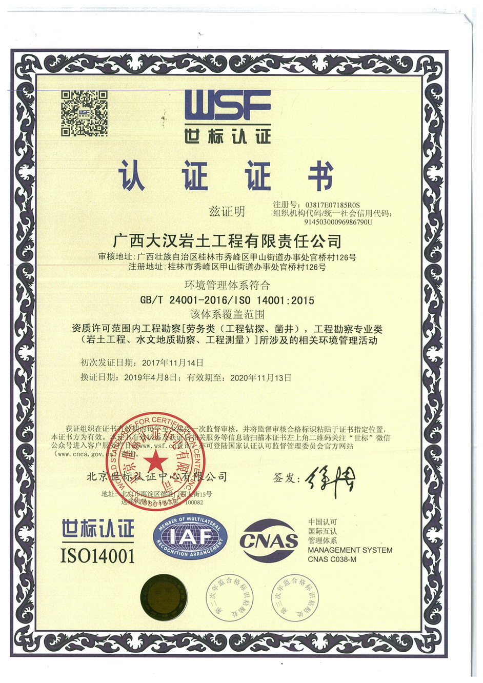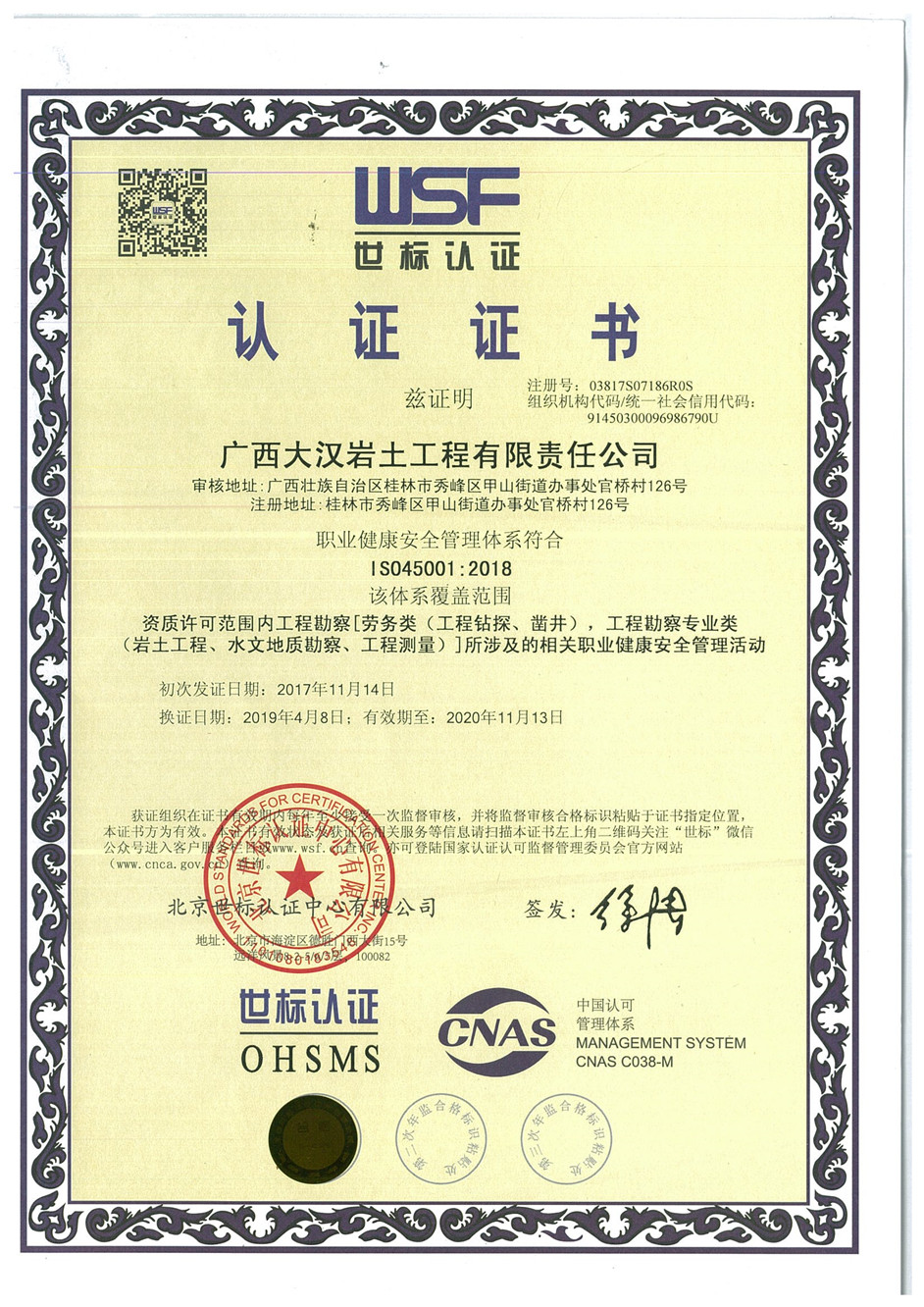廣西大漢巖土工程有限責(zé)任公司嚴(yán)格執(zhí)行體系管理要求,2018年各項(xiàng)管理符合體系要求,圓滿通過(guò)環(huán)境管理體系(ISO 14001:2015)、職業(yè)健康管理體系(ISO 45001:2018) 、質(zhì)量管理體系(ISO 19001:2015),其中職業(yè)健康管理體系由OHSAS18001:2007換標(biāo)至ISO 45001:2018