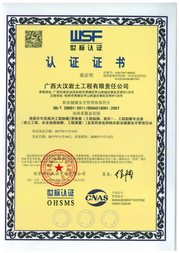 公司逐步壯大、發(fā)展,在管理上日趨成熟,為更系統(tǒng)地做好各項(xiàng)工作,參照質(zhì)量管理體系ISO 9001、環(huán)境管理體系ISO 14001、職業(yè)健康管理體系OHSAS18001管理要求規(guī)范日常作業(yè)流程,2017年9月接受北京世標(biāo)認(rèn)證中心有限公司監(jiān)督審核,11月14日通過并取得ISO 9001、ISO 14001、OHSAS18001體系認(rèn)證證書。